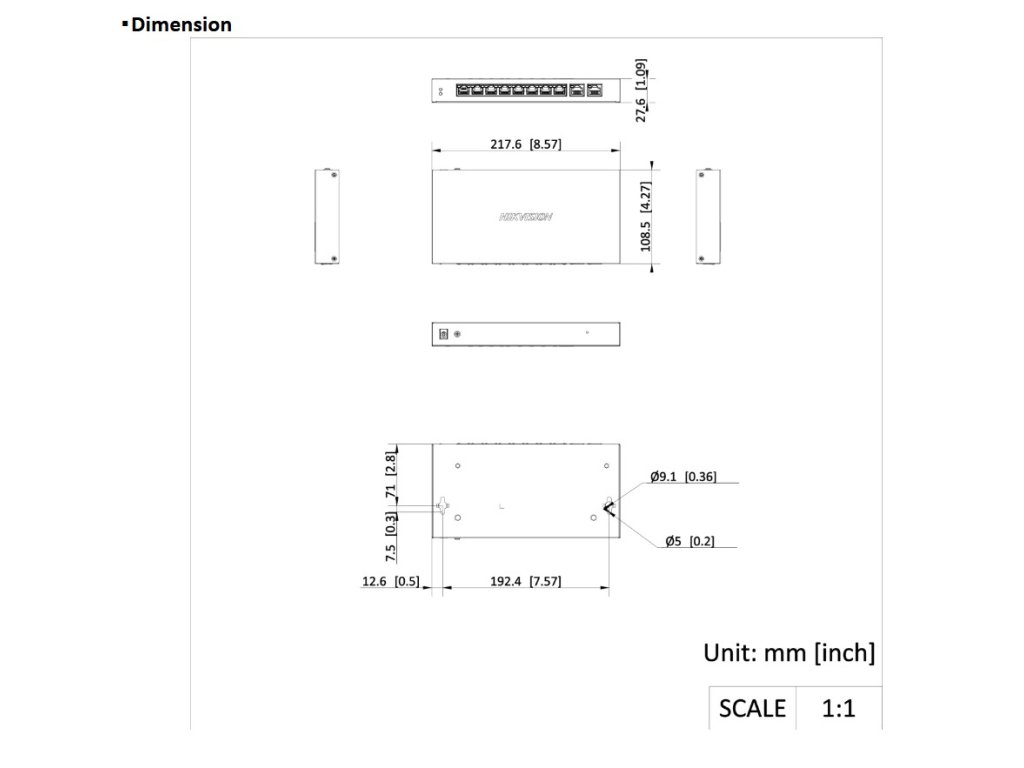 8 × 10/100 Mbps Hi-PoE (60W), 2x uplink port 10/100/1000Mbps, extend režim až na vzdálenost 300m, management přes webové rozhraní a Hik-Partner(vizualizace topologie sítě, alarmy typu PUSH, monitoring stavu zařízení v reálném čase, správa šířky pásma, náhled trasování, rozpoznávání zařízení, náhled živého snímku, restart portů), max. celkový výkon PoE 60 W, přepínací kapacita switche 3,6Gbps, přepěťová ochrana do 4KV, pracovní teplota: 0 - 40C°, Napájení: 54VDC/1,2A(adaptér je součástí baení),instalace na poličku, rozměry: 217,6 x 27,6 x 108,5 mm.