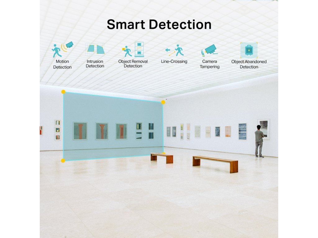 - Inteligentní detekce: Dostávejte oznámení a kontrolujte kanály, když někdo překročí hranici, vstoupí do nastavené oblasti, zakrývá kameru nebo odstraňuje/opouští předměty.