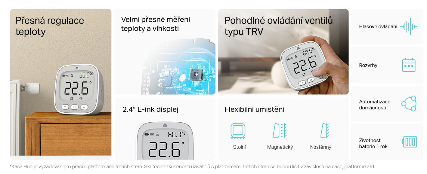 - Přesná regulace teploty - Reguluje chytré termostatické radiátorové ventily Kasa v místnosti tak, aby bylo dosaženo požadované teploty nastavené pokojovým termostatem.